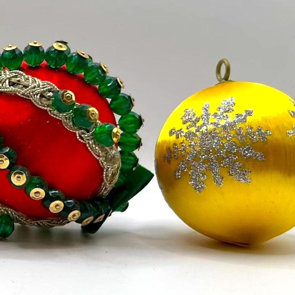 Round ball ornaments with hand-applied sequins, beads, and floral elements