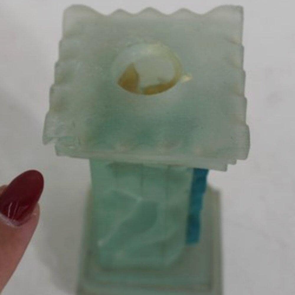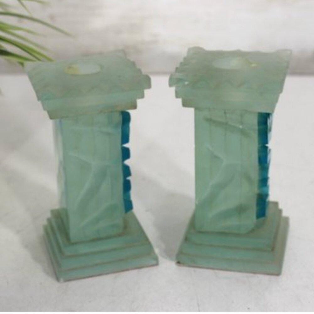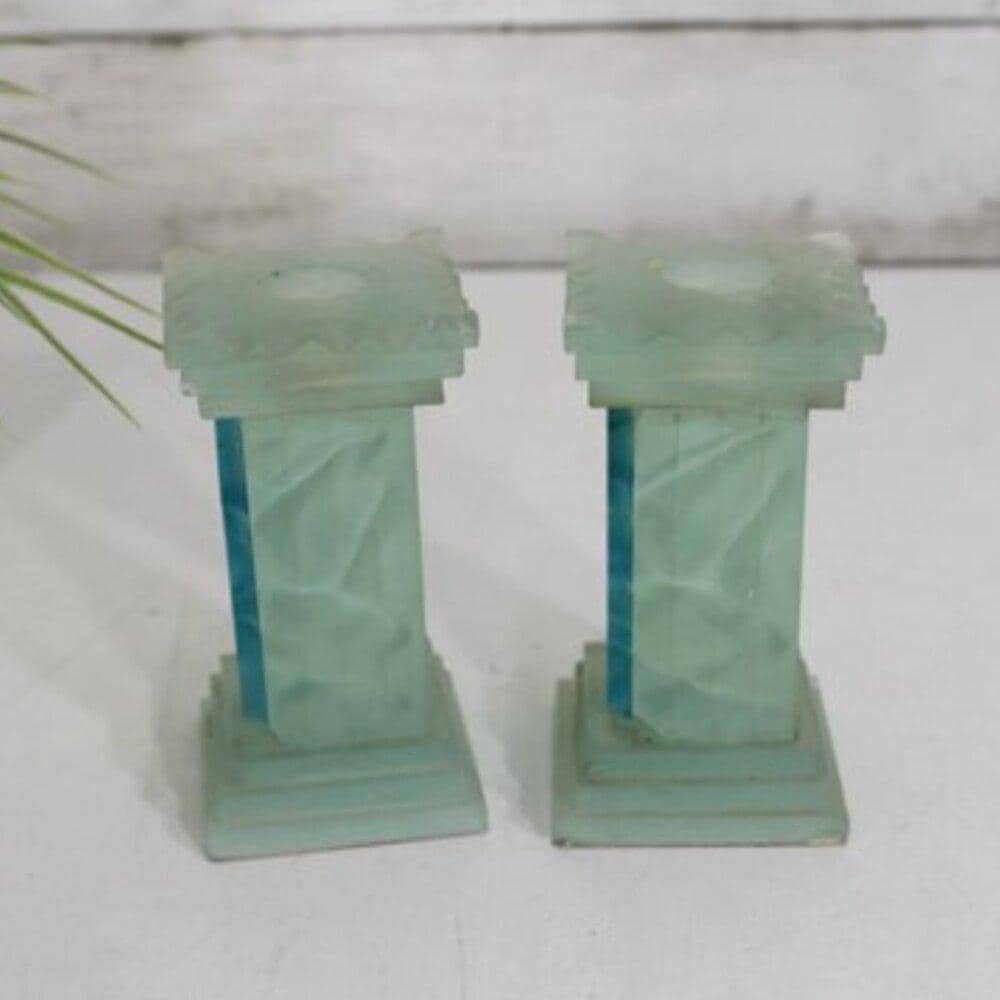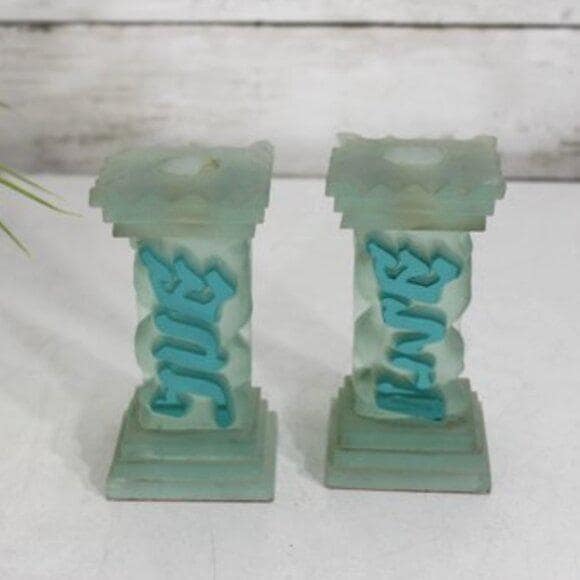 Pair of beautiful vintage Shabbat candlesticks featuring "Shabbat Shalom" inscription. This matched pair of ceremonial candlesticks showcases Art Deco-inspired stepped geometric design in stunning turquoise and jade colors and frosted finish with a protective red felt base.