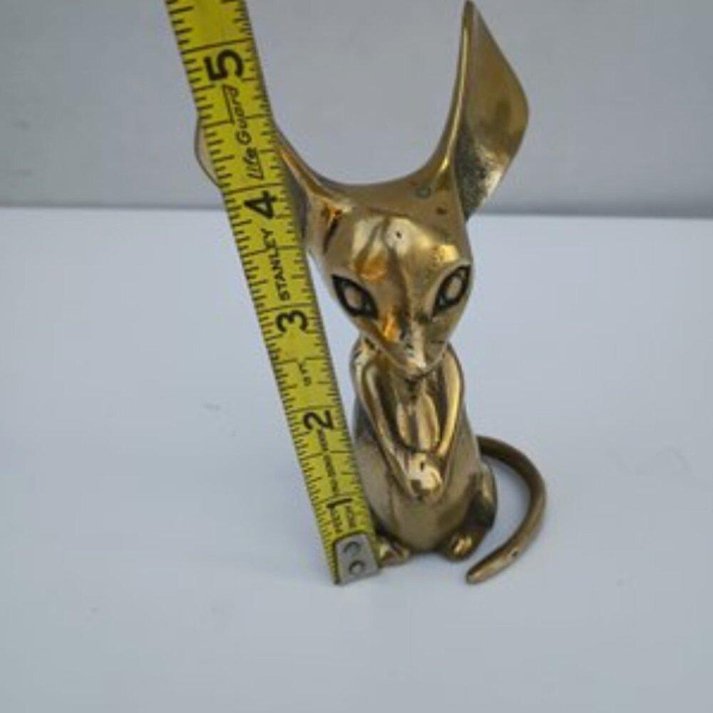 Delightful vintage solid brass mouse figurine handcrafted in Korea by K.P. Enterprise! This charming Mid-Century piece showcases the exceptional brass craftsmanship Korea became renowned for during the 1950s-60s. Featuring oversized ears, expressive eyes, and a gracefully curled tail, this whimsical mouse makes a perfect paperweight or decorative accent.