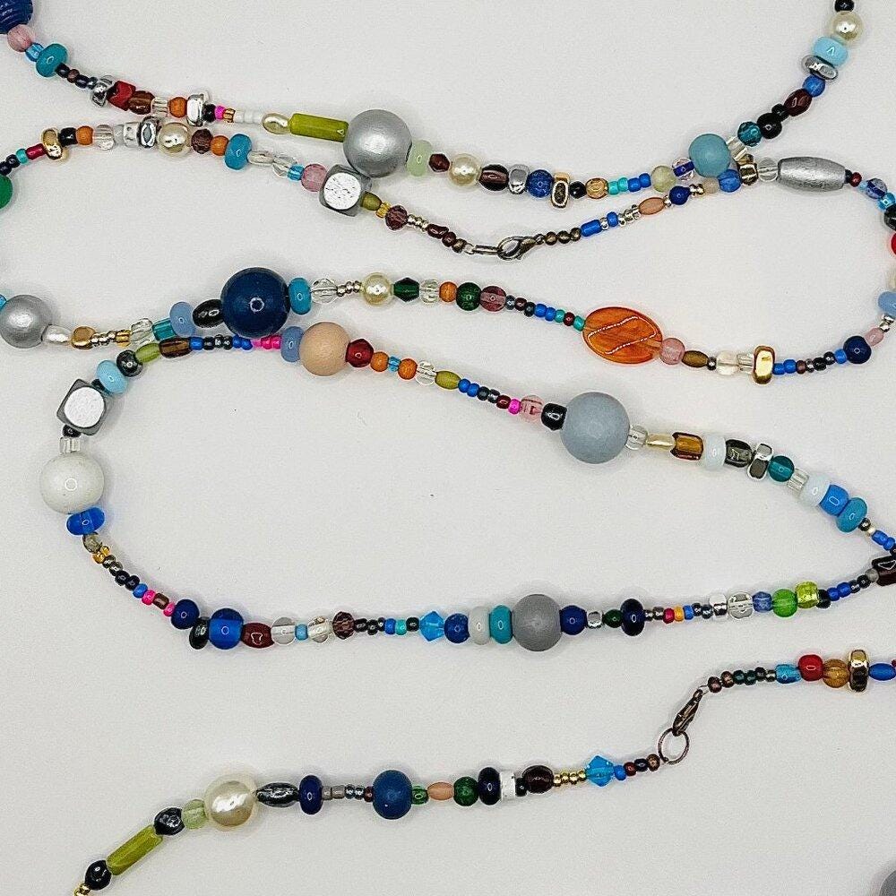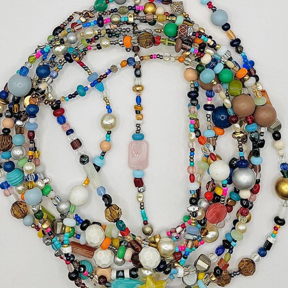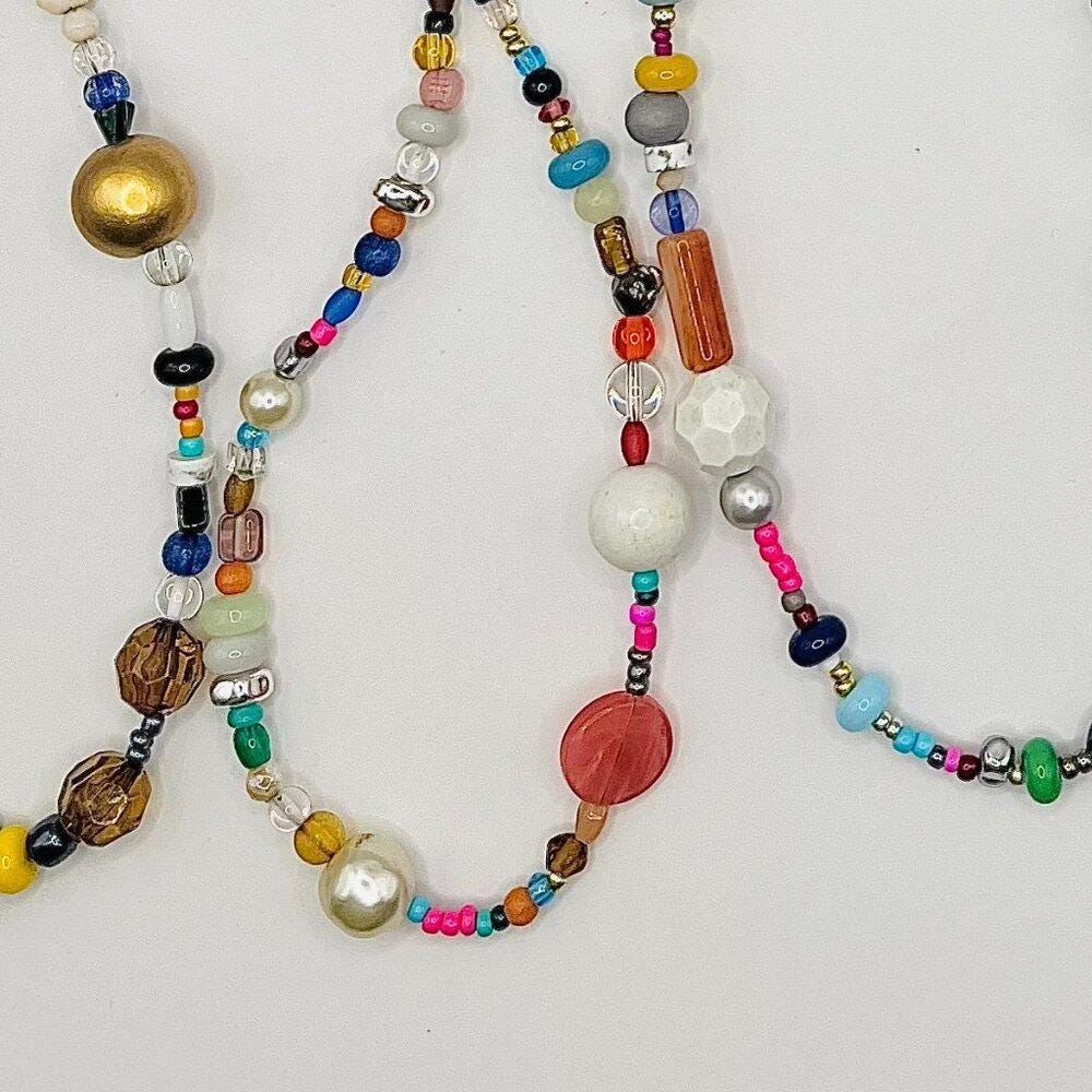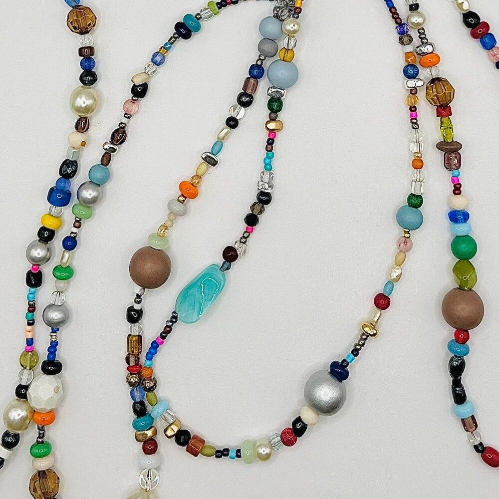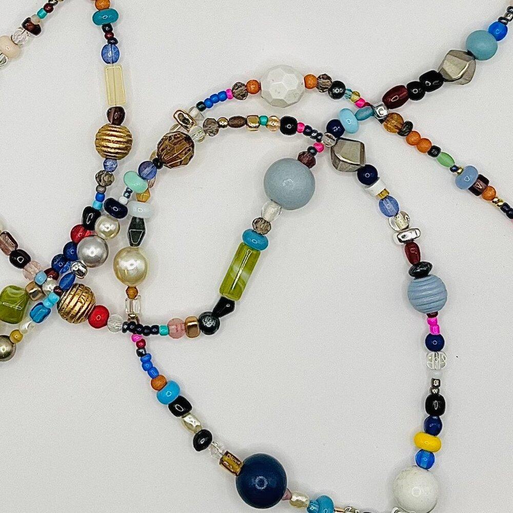 Various materials: glass beads, pearls, wood, metal accents, semi-precious stones