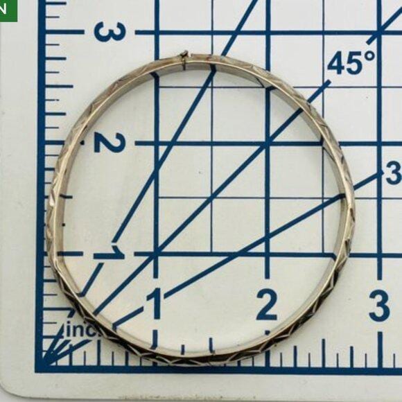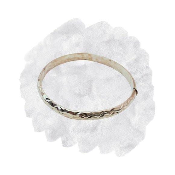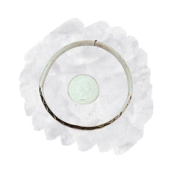 Beautiful HAN sterling silver hinged bangle bracelet featuring elegant etched detailing! This classic piece showcases a textured diamond/zigzag pattern and convenient hinged opening for easy wearing. Quality sterling silver construction at 8.49 grams.