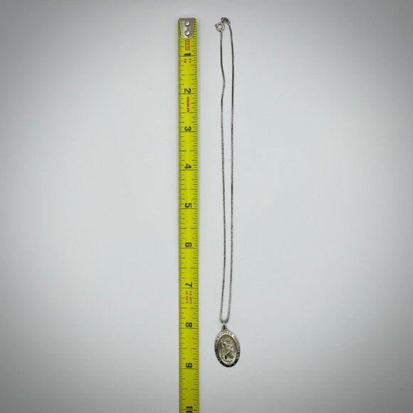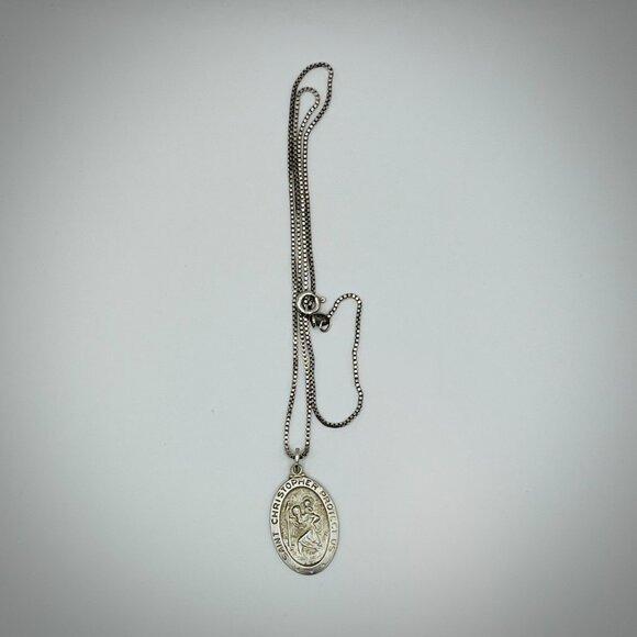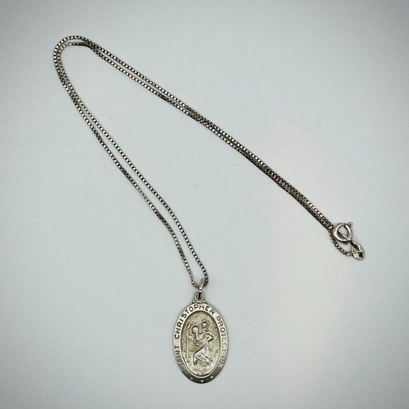 Classic sterling silver Saint Christopher medal on a fine Italian box chain. This timeless religious pendant features detailed relief imagery of St. Christopher carrying the Christ child with "Saint Christopher Protect Us" inscription around the border. A meaningful piece of faith-based jewelry perfect for travelers and devotees.
